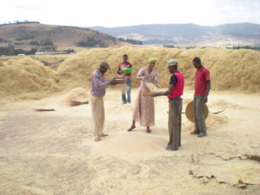 One day in our walking we came across some farmers thrashing out (separating) the grain of teft from the straw by using 8 or 10 cows to trample it on a threshing floor. There are many piles of straw in the fields around us which Jemal says is teft. Later that day while riding in the van, we saw 3 men in a field winnowing the teft in the manner used in the bible times. One man would throw the grain in the air with a winnowing shovel and 2 others fanned it, each with a large skin winnowing fan, separating the chaff (which the wind bloweth away) from the grain. Isn’t that what the Lord is doing with our lives and his church, running us through a customized thrashing process? The next day we saw a group of workers in the field near our house sifting the tiny grain with a sieve. From this they make enjara, the flat flexible “bread” used in eating a meal with the hands and silverware is not needed.