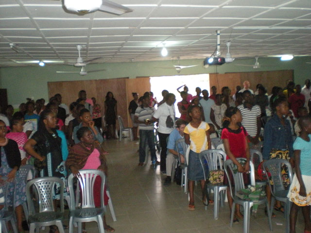 On Monday afternoon, there was a baptism in the nearby Niger River in which 60 (tripled from last year) were buried with Christ in water, including young children, many young adults, mothers and their children; there were two teams of baptizers. The older ones were baptized first, and then they sang and praised God as the younger ones came along. There has been a lot of emphasis in this conference for the young people to make decisions and that there will be lifelong effects of such decisions. The meeting hall has been full and overflowing (a couple dozen or so sitting outside). My count of chairs came to about 175, so attendance has doubled from last year. The last night of “the great feast” was the most grand and glorious of all meetings. It started at 8 PM and lasted well beyond midnight. First it was an hour or so of very lively praise, which lasted throughout the meeting. Then there were four or five teams ministering in prayer to what must have been 90-95% of the people: prayers for healing, deliverance and encouragement. The evil prince/spirit of Dagon/Mammy-water has wrought terrible destruction to the souls of some of these young people.